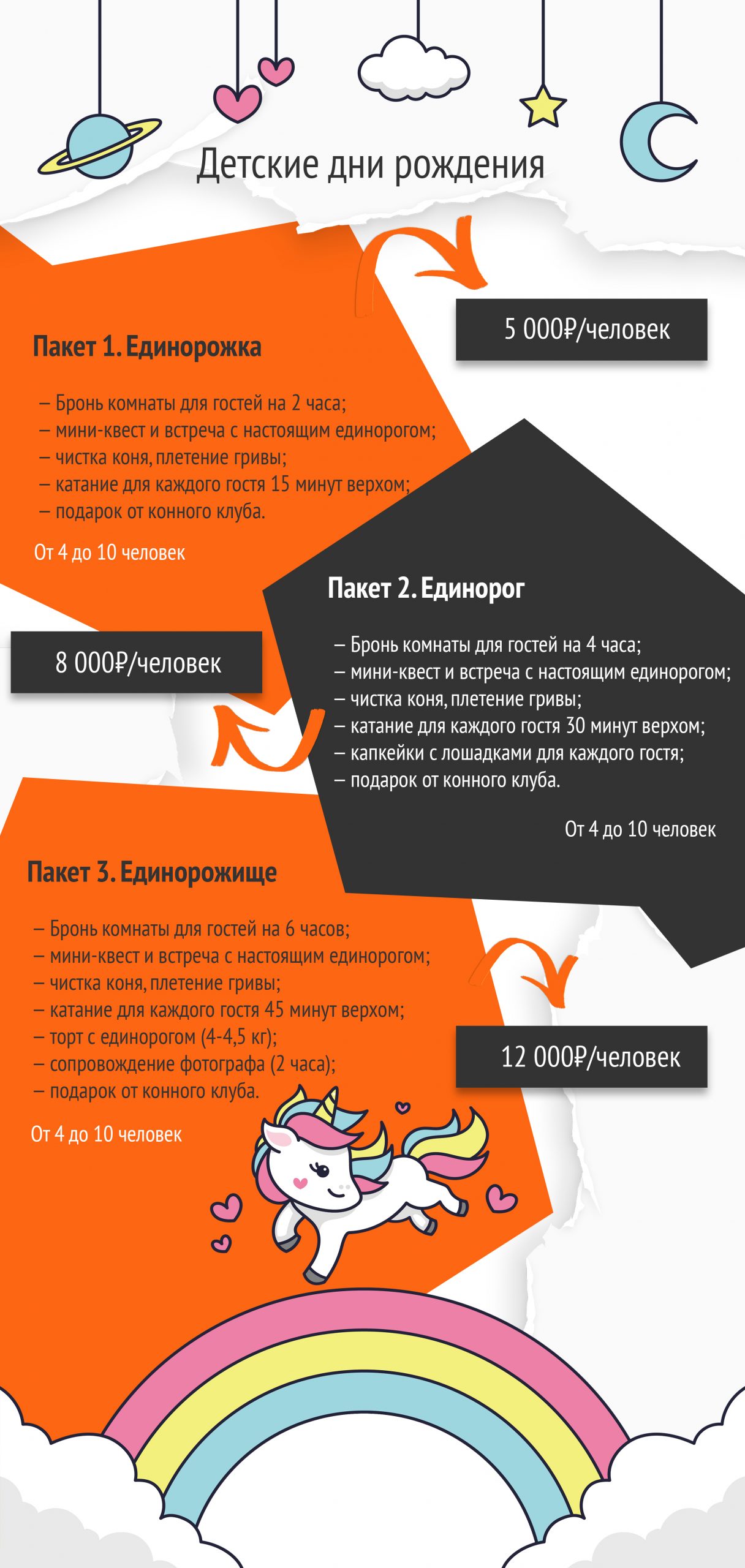 - Еда и напитки (кроме капкейков для пакета «Единорог» и торта для пакета «Единорожище»). Вы можете привезти свою еду и напитки или сделать заказ у нас (меню высылаем в мессенджер).
